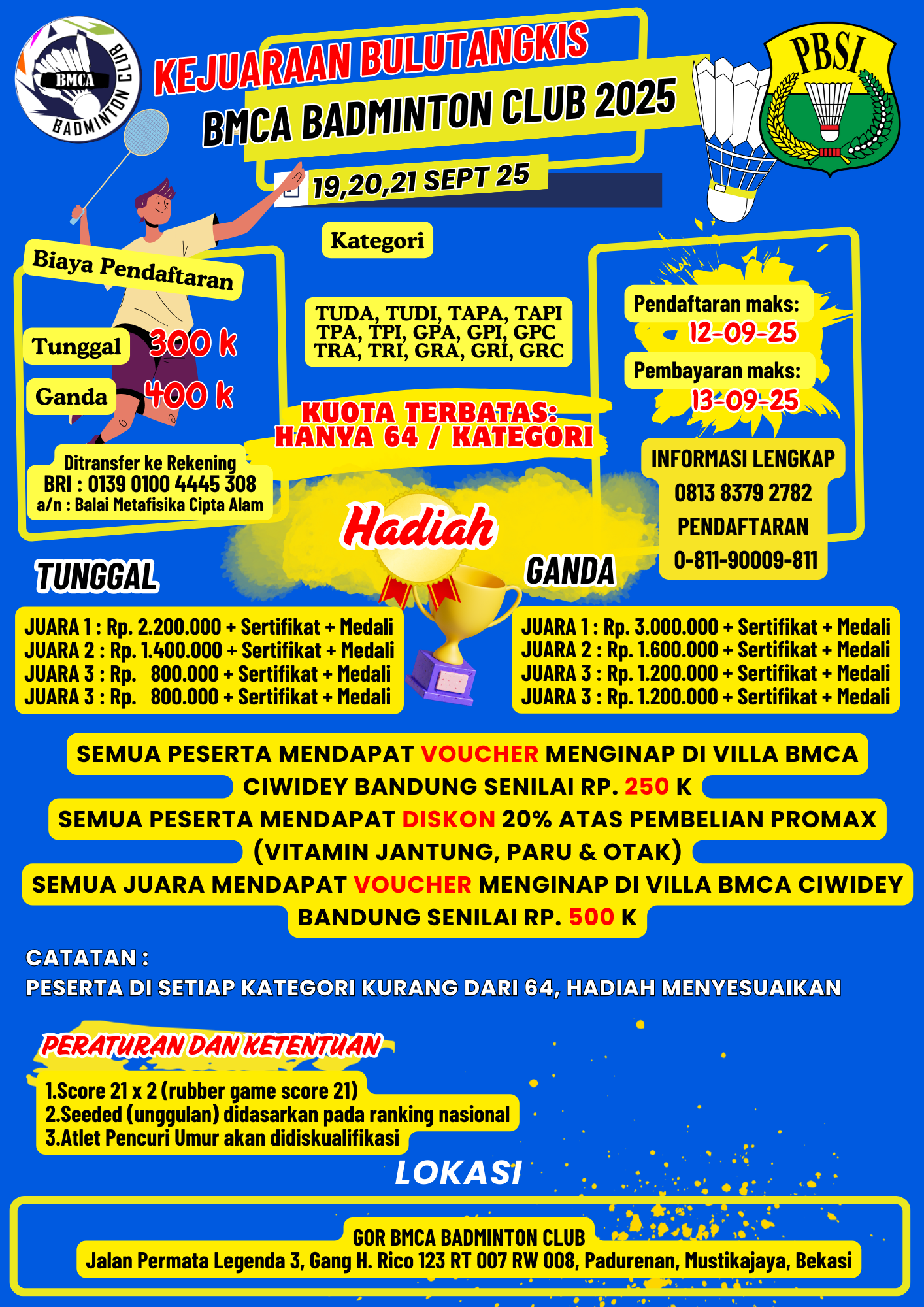 Umum BMCA OPEN 2025 : 19,20,21 Sept 2025 1 min read 5 months ago yusuf About The Author yusuf See author's posts Post Views: 284 Continue Reading Previous Daftar Pemain RI Kejuaraan Dunia Bulutangkis 2025, Jojo hingga Jafar/FeliNext SIRNAS DIY 2025